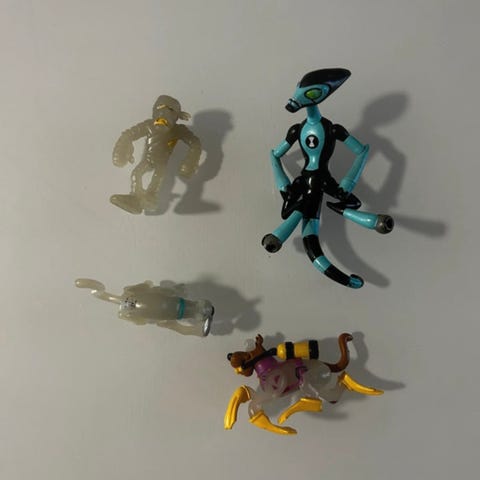Sæt bestående af forskellige legetøjsfigurer inklusiv dyr, dinosaurer, mennesker og tilbehør som net og våben. Materialer og størrelser varierer. Velegnet til leg og samling.