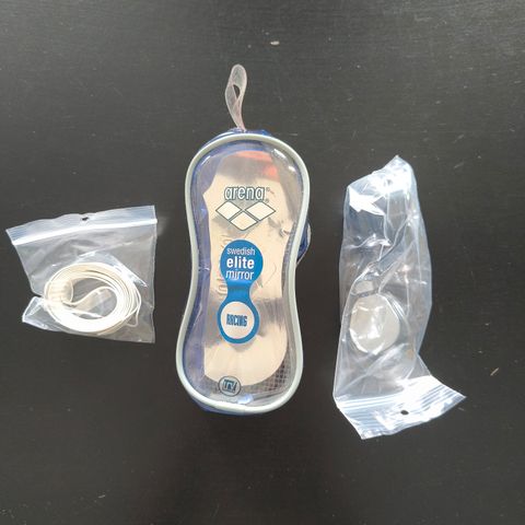 Svømmebriller med projekteret display der viser svømmehastighed, distance, mm. på indersiden af brilleglasset. Inkluderer et opbevaringsetui og ekstra næsepuder til tilpasning, samt USB stik til opladning.