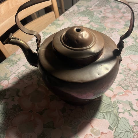 Kobber tekande med låg og træhåndtag. Tekanden har en rund form med hamret overflade og en udformet tud. Velegnet til brygning og servering af te.