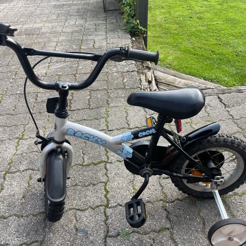 Rocky børnecykel med 12 tommer hjul i blå farve. Cyklen har støttehjul og er designet til børn.