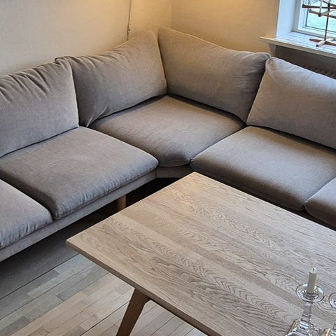 3 pers. højrevendt hjørnesofa med puf afslutning. Koldskum, inkl ben.
