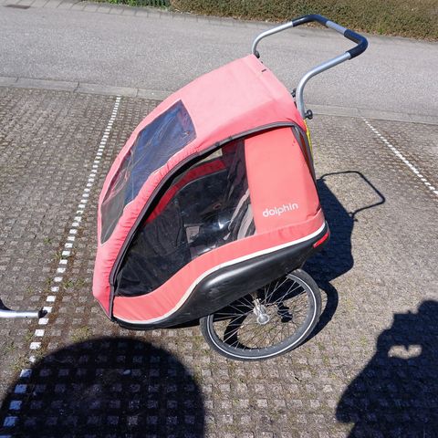 Winther Cargovogn cykelanhænger til børn med plads til to børn. Anhængeren har sikkerhedsseler til begge sæder, transparent regnslag og net.
