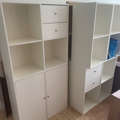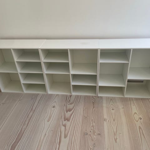 3 hvide ældre reoler på hjul. Vægophæng følger med. Nypris 4.500 kr. pr stk.