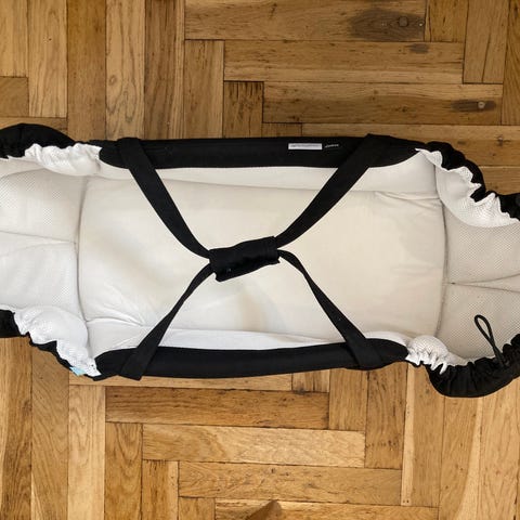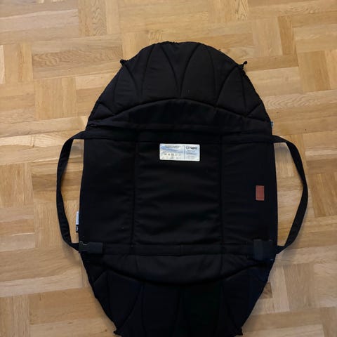Najell Sleep Carrier (sort), Graviditetspude (beige), Foot Muff (sort), og pre-tied Wrap (mørk tigerstribet). Alle uåbnede.