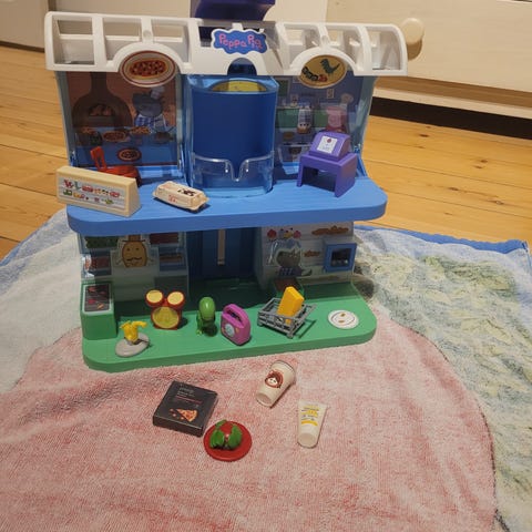 Gurli Gris supermarked i to etager med forskellige møbler og tilbehør. Sættet inkluderer stole, borde, en indkøbsvogn og andre små genstande. Der er en højttaler der kan sige supermarkedslyde.