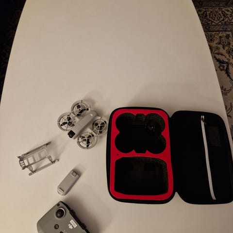 DJI Neo leveres med fjernbetjening, ekstra propeller, 3 batterier alle opladet max 3 gange, opladerkabel og brugervejledning. Dronen har beskyttelsesgitre omkring propellerne. Virkelig god og holdbar begynderdrone vejer kun 135 g. Sælges pga køb af større drone.