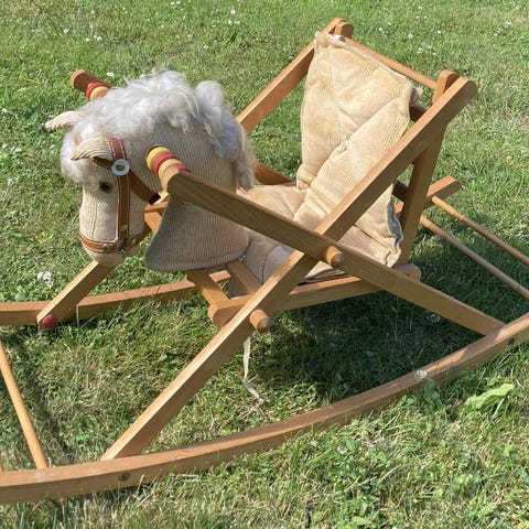 Gammel og slidt gyngehest. Den har stået i en lade en del år. Jeg har rengjort den. Dette kan nok gøres bedre. Tænker den vil være flot at male. Du kan lige nå det inden jul. Obs den ene vange hvor spidserne af træ mangler. DIY projekt. Ren nostalgi.