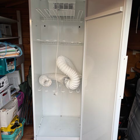 Asko tørreskab med enkelt dør og hvid finish. Indvendigt er der flere hylder som kan skubbes ud, og hvor der også kan hænge bøjler fra når tøjet skal tørres. Kan tørre både flyverdrager/vinter overtøj på 1 time. Kan også nemt tørre fin tøj som fx silke eller skjorter imens det hænger på en bøjle. Er super til en børnefamilie eller andre der gerne vil have tøjet tørre hurtigt, men ikke smider det i tørretumbleren. Har brugsspor da der har ca 8-10 år på bagen, men virker stadig helt ubeklageligt. Udluftningsrøret er dog blevet væk, da vi har haft den til at så i en garage de sidste på år. Bruger det samme i strøm som en alm tørretumbler. Fylder det samme som et fryseskab/køleskab. Udvendig mål er 190 cm høj/ 61 cm dyb/ 60 cm bred.