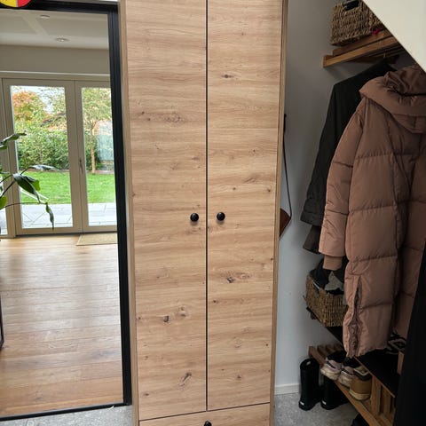 Skabet skal afhentes i Hellerup og afmonteres eller bæres ned fra 1. sal (trappen er ret bred). Min mand kan evt. hjælpe med at bære. Skabet er fra januar 2024.