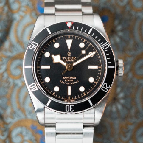 Tudor Black Bay i stål med sort skive og sort krans, på Forstner stål lænke og medfølgende original Tudor læder rem og foldespænde sælges