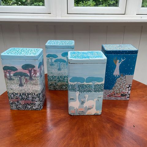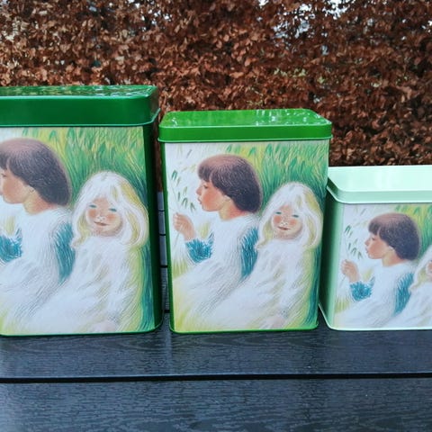 Flot sæt originale Davre metaldåser med det klassiske og eftertragtede motiv “Davre-pigerne”, malet af Aage Sikker Hansen til FDB i 1945.