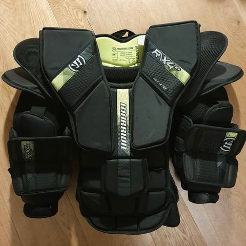 Brugte sorte Warrior goalie pads med hvid tekst.
