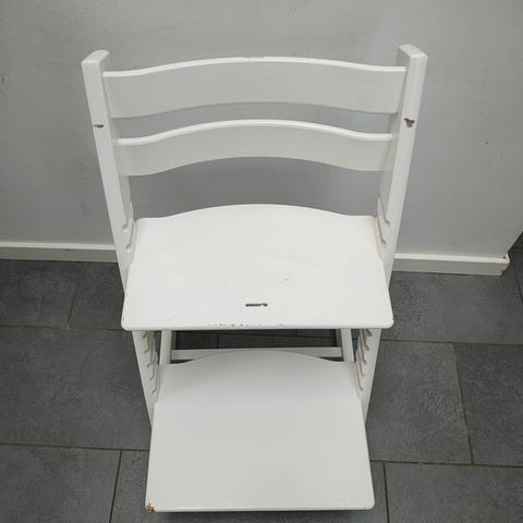 Stokke Højstol i hvidt træmateriale. Justerbar højstol. Sendes ikke.