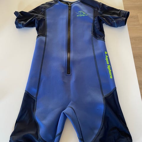 Aqua Sphere Børne Svømmedragt i størrelse 110. Dragten er grøn med blå detaljer og designet til svømning. Kun brugt 1 gang