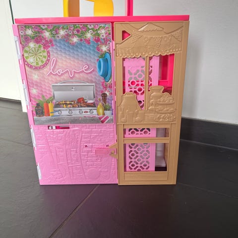 Barbie Dukkehus legetøj i lyserøde og hvide farver med flere rum og åbne vinduer. Legetøjet kan foldes sammen for nem opbevaring og transport. Designet til børns leg og fantasiudvikling.