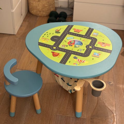 Bord med fire aktivitetsplader, opbevaringsplads og puslespil samt klodser til at forhøje bordet