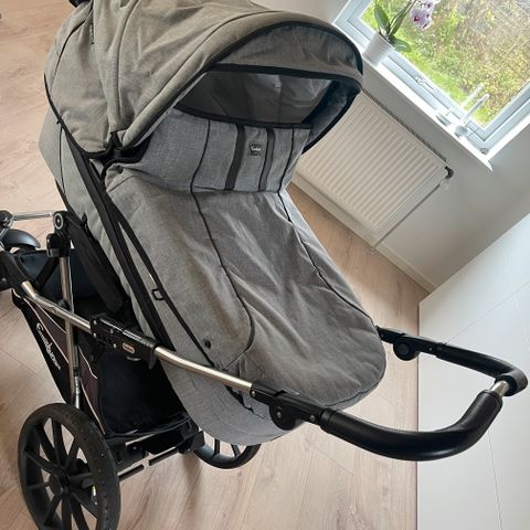 Sort m sort/hvidternet mønster. Pæn og velholdt stort liggemål. Thermobase i bund. Drejbare forhjul, alustel. Der er indbygget insektnet og solskærm i kalechen. Der medfølger sort lift og madras.