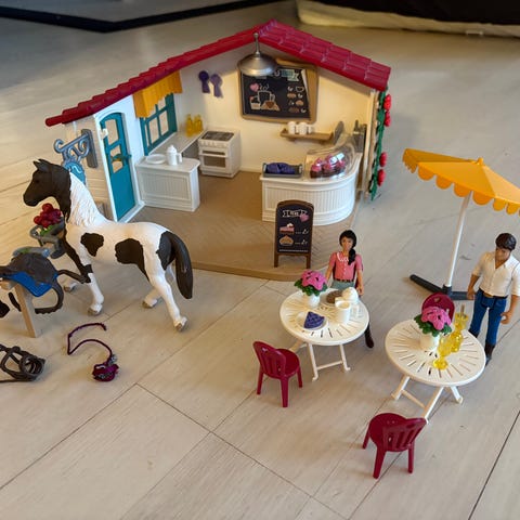 Schleich Horse Club legetøjs sæt indeholder en caféindretning med borde, stole og diverse tilbehør til rollespil. Sættet er designet til børn og inkluderer detaljerede figurer og rekvisitter, der kan bruges til at skabe scenarier omkring en hesteklub.