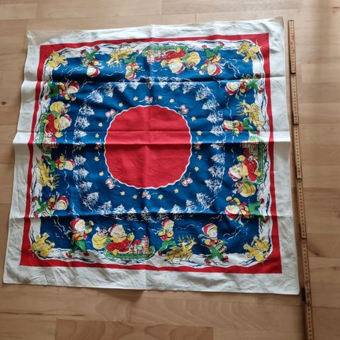 Vintage hjemmelavet juletræstæppe i fin stand, dog enkelte spor af stearin. Mål: 128 x 120 cm. Pris: 100 kr kontant. Se gerne mine andre annoncer.