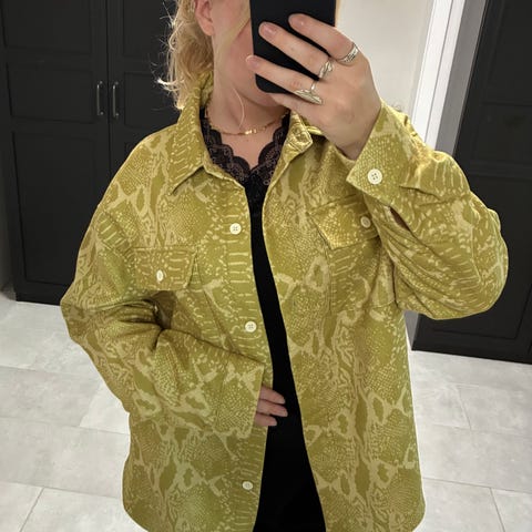 Grøn kvindejakke i størrelse 46 (lille i størrelsen). Jakken har flere lommer med lynlås og et bælte i taljen. Materialet fremstår som let og egnet til overgangsvejr. Jakken har en klassisk og enkel stil uden synlige mærker eller logoer.