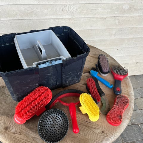 Indeholder, , hov renser, man kam, gummi rup samt strigler. Har opbevarings spor, efter at have stået opbevaret i stalden- lidt ridser på toppen.