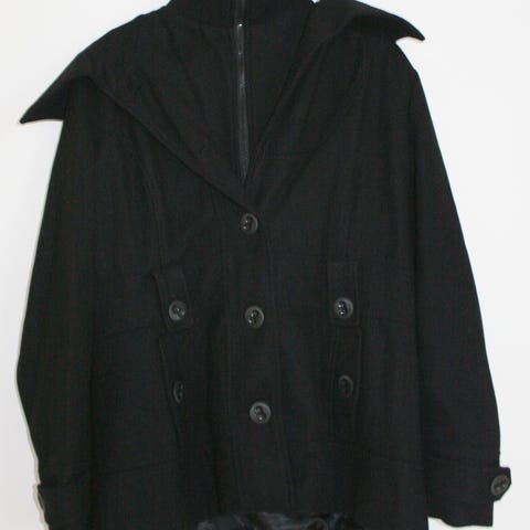 Sort jakke med lynlås og knapper i størrelse L. Jakken har høj krave og stiklommer i siden.
