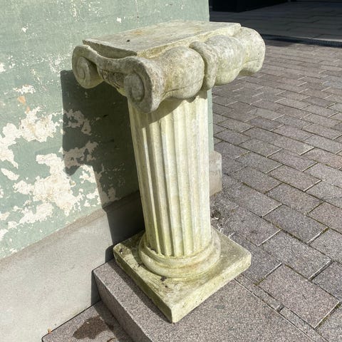 Klassisk søjle i hvidt træ med detaljeret kapitel og firkantet fod. Søjlen har en fluted overflade og er velegnet til dekorative formål i haven eller stuen eller som en del af interiørindretningen.