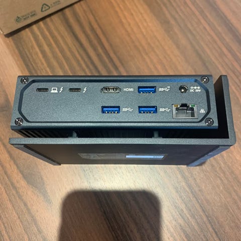 CalDigit Thunderbolt dockingstation med flere porte inklusive USB, Ethernet og lydudgang. Enheden har en robust metalfinish og er designet til at forbinde forskellige eksterne enheder til en computer via Thunderbolt-forbindelse.