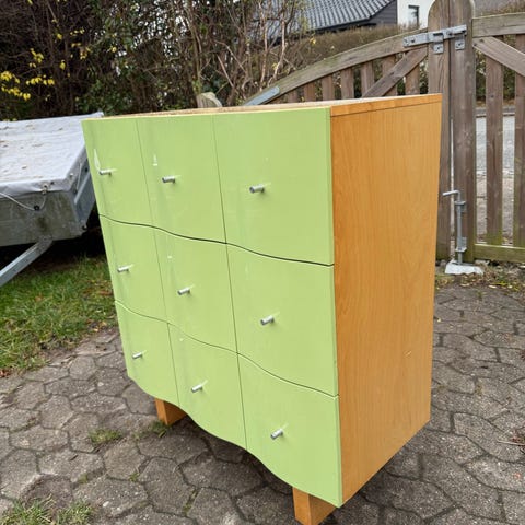 Et sjældent fund hvis du ønsker et totalt hipt retro møbel i din entre. Bemærk de fine greb på kommoden. Og hessian vægfladen langs spejlet. Ikke et øje er tørt. Gennemført 70’er retro!