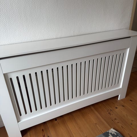 Hvid radiatorafdækning med gitterdesign i træmateriale, designet til at dække radiatorer og samtidig tillade varmeudstrømning. Passer til standard radiatorstørrelser og kan anvendes i forskellige rum for at forbedre æstetikken omkring radiatorer.