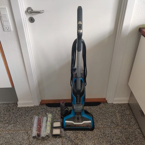 Bissell Carpet & Upholstery Washer med 30 minutters rengøringstid og ekstra tilbehør. Inkluderer slange og diverse komponenter til rengøring af tæpper og møbler.