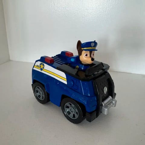 Paw Patrol Chase bil der kan foldes sammen så den ligner et hundehus som i den oprindelige serie. og kører selv med fjederkraft fremad når den foldes ud til politibil