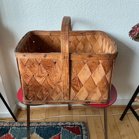 Flettet kurvlampe fremstillet af naturmateriale. Lampen har en stor, rund form med tekstur, der fremhæver det håndværksmæssige design. Velegnet til dekoration i stuer eller spisestuer for et naturligt og rustikt udtryk. Er taget med hjem fra Sydafrika. Bruges til dekoration eller som vase for kunstbllmster 90 cm bred og 50 cm høj