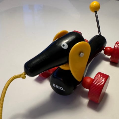 BRIO Træhund Trækdyr med hjul i sort, rød og gul