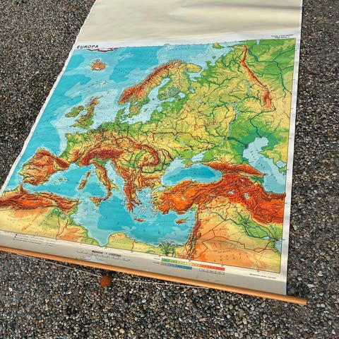 Vægkort over Europa med detaljerede geografiske oplysninger. Kortet viser lande, byer og vigtige geografiske træk i Europa. Fra 1993
