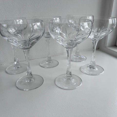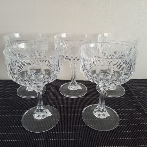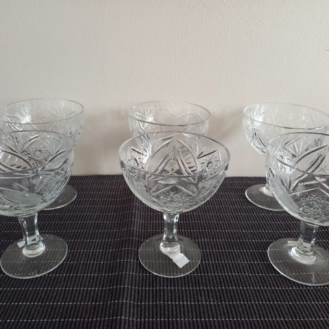 Champagneskåle/cocktailglas 4 stk. i krystal, h 11 5 cm, Ø 10 cm. Glassene er fejlfrie i perfekt stand. Pris kr 50/stk afhentet Kbh Ø. Sikker forsendelse kr 50