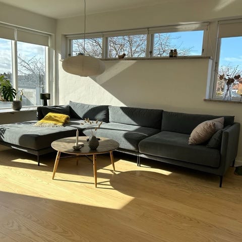 Brugt men forholdsvis velholdt, få synlige brugsspor, armlænet modsat chaiselong er lidt ujævnt, ikke synligt men kan mærkes hvis man lægger vægt på det.