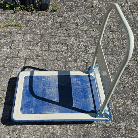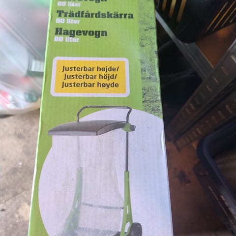 Sort vogn til transport af havesæk med hjul. Vognen har en holder til kost m.m.