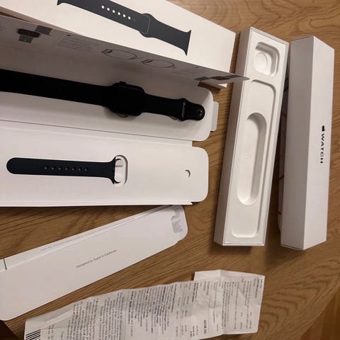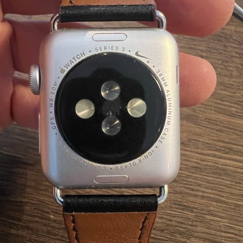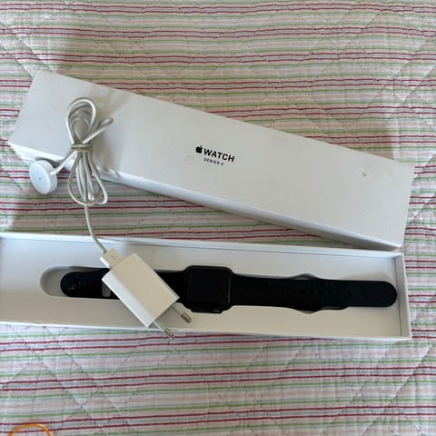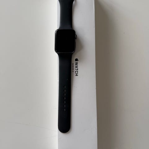 Apple Watch Series 3 smartwatch med en 42 mm urskive. Uret har en sort rem og sort urkasse. Designet til brug for både mænd og kvinder.