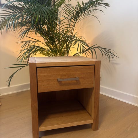 Natbord i nordisk retro stil, udført i flot eg strukturmelamin og mat hvidt korpus. Natbordet er udstyret med en grebsfri skuffe samt opbevaringsplads på hylde. Natbordet er monteret med ben i massiv egetræ.