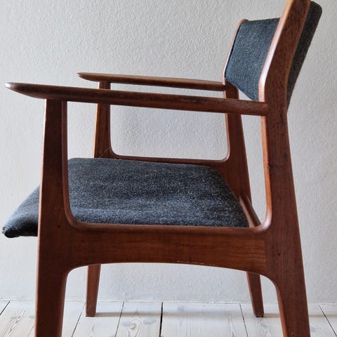 Dansk designet armstol af Kai Lyngfeldt Larsen. Sjældent udbudt til salg. Svært at afgøre træsorten, men minder om teak, mahogni, palisander. Står med flot olivengrønt stof sæde uden huller eller mærker. # retro, stol, stole, armstol, dansk design, danish design, moderne, antik, vintage.