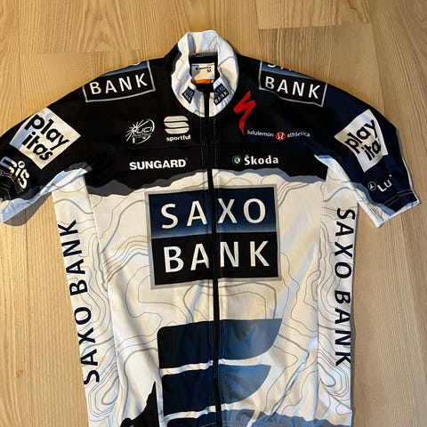 Saxobank cykeltrøje og bib shorts sæt i gul og blå farve. Sættet består af en kortærmet cykeltrøje og tilhørende bib shorts med seler. Materialet er egnet til cykling, designet til at give komfort og bevægelsesfrihed under træning eller løb.