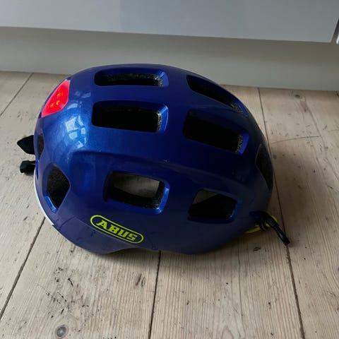 Abus Macator cykelhjelm i blå farve. Den er helt ny i æske og har et visir der kan tages af og på.