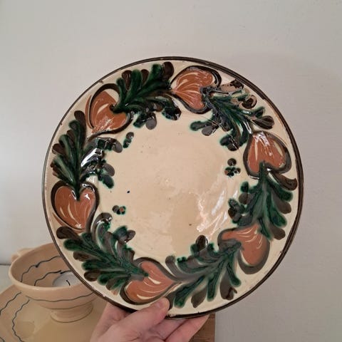 Keramisk vægplatte med håndmalet motiv af en person i bevægelse. Platten har en rund form med en grøn kant og er udstyret med ophæng på bagsiden til vægmontering. Farverne inkluderer grøn, sort og beige. Platten er velegnet til dekorativ brug i hjemmet.