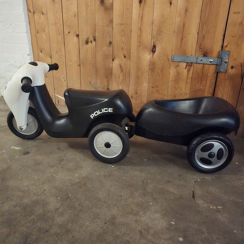 Polis legetøjsmotorcykel i sort og hvid farve. Fremstillet af plastik med store hjul og sæde til børn. Designet som en politimotorcykel med håndtag og detaljer i sort og hvid.