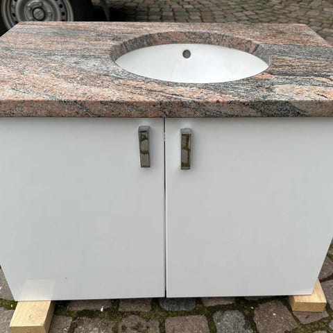 Granitbordplade med integreret vask. Bordpladen er lavet i grå granit med slebet overflade, tykkelse 3 cm, dybde 55 cm, længde 83 cm