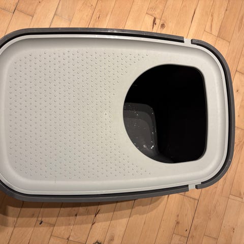 Et rummeligt, højt kattetoilet med frontindstigning & dobbeltklaplåg, nem at rengøre, med udtagelig plastpresening, passende clips, krog & skovl, mål: 52 x 40 x 42,5 cm