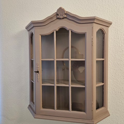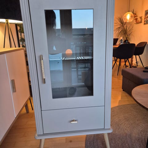 Fin vægvitrine malet i en lys blå støvet farve udenpå og hvid indeni. Hylden kan tages ud og grebene skiftes til messingfarvede (se billede). Jeg har to stk.