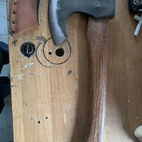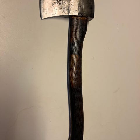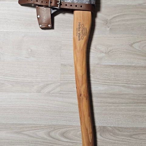 Øyo økse som fremstår som næsten helt ny. Øksen har stået som pynt i stuen og har kun været forsøgt brugt et par enkelte gange.