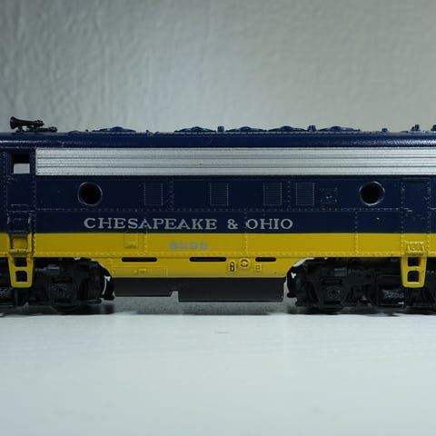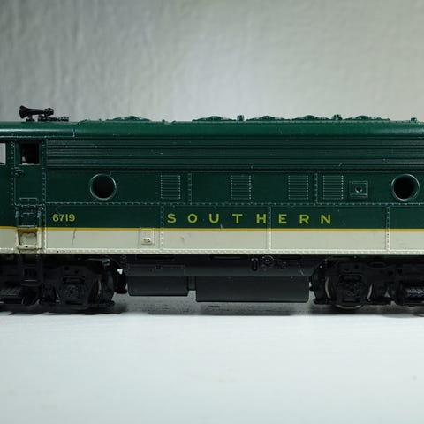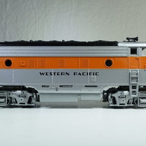 Southern Pacific modeltog i sort og orange farve. Detaljeret miniaturetog med tekst 'Southern Pacific' på siden. Velegnet til modeljernbaneopsætninger og samlinger.